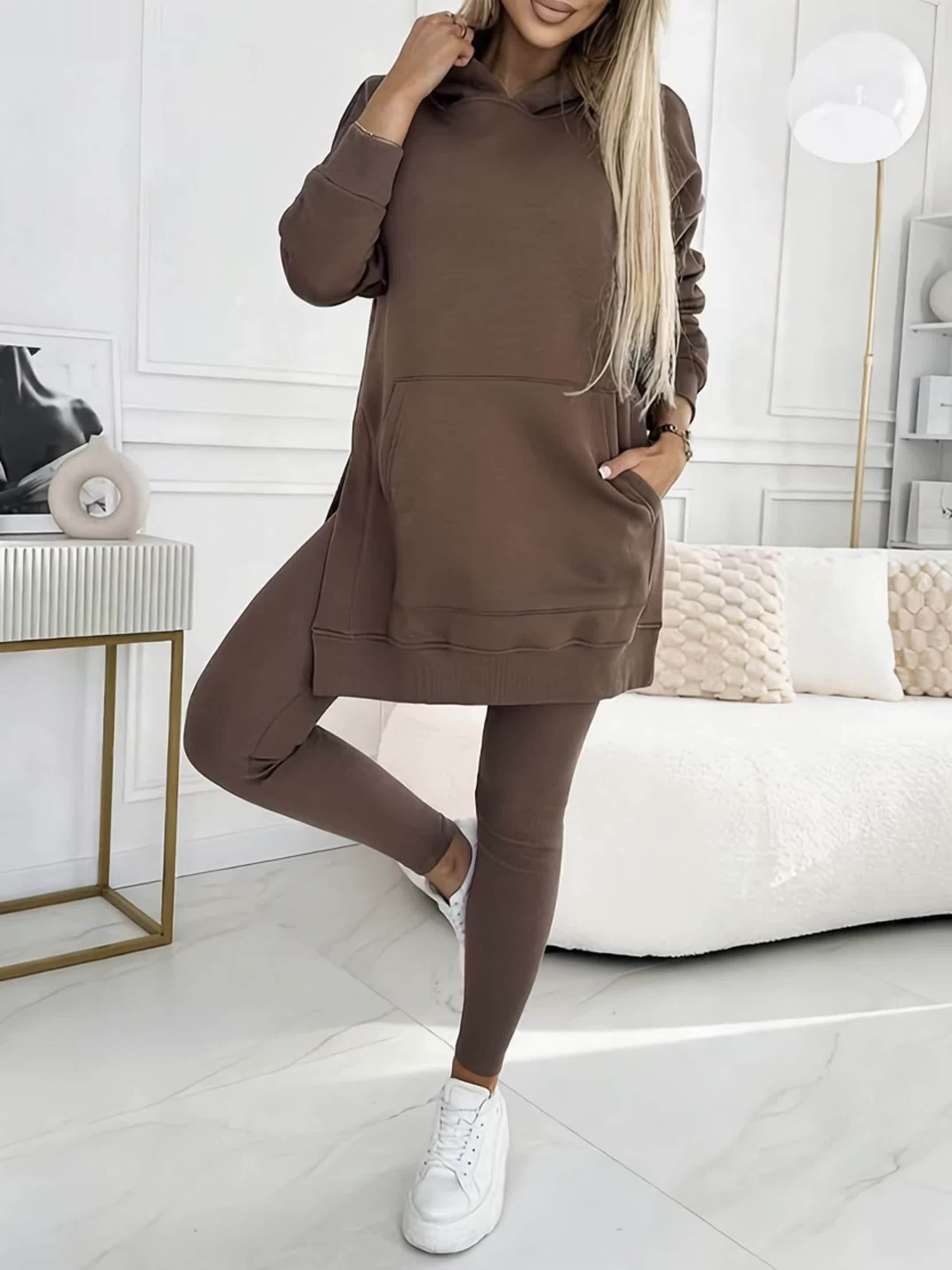 Women'S Elegant Long Sleeve Hoodie & Leggings Set - Cozy Brown Pullover with Drawstring Hood, Slim Fit Pants, Perfect for Fall/Winter, Casual Wear, Casual Wear|Sleek Fitted Top|Stretchy Fabric