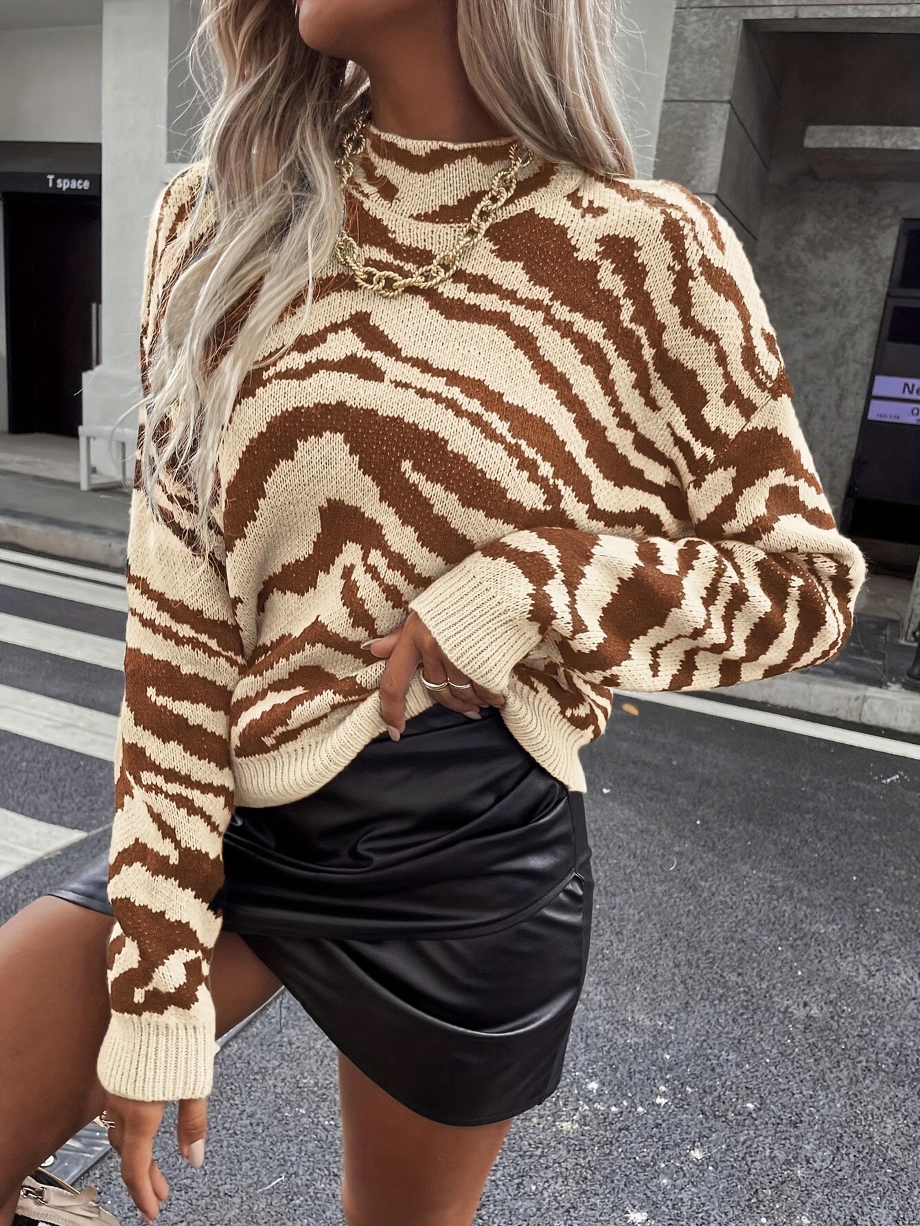 Zebra Striped Mock Neck Sweater, Elegant Long Sleeve Sweater For Fall & Winter, Women's Clothing