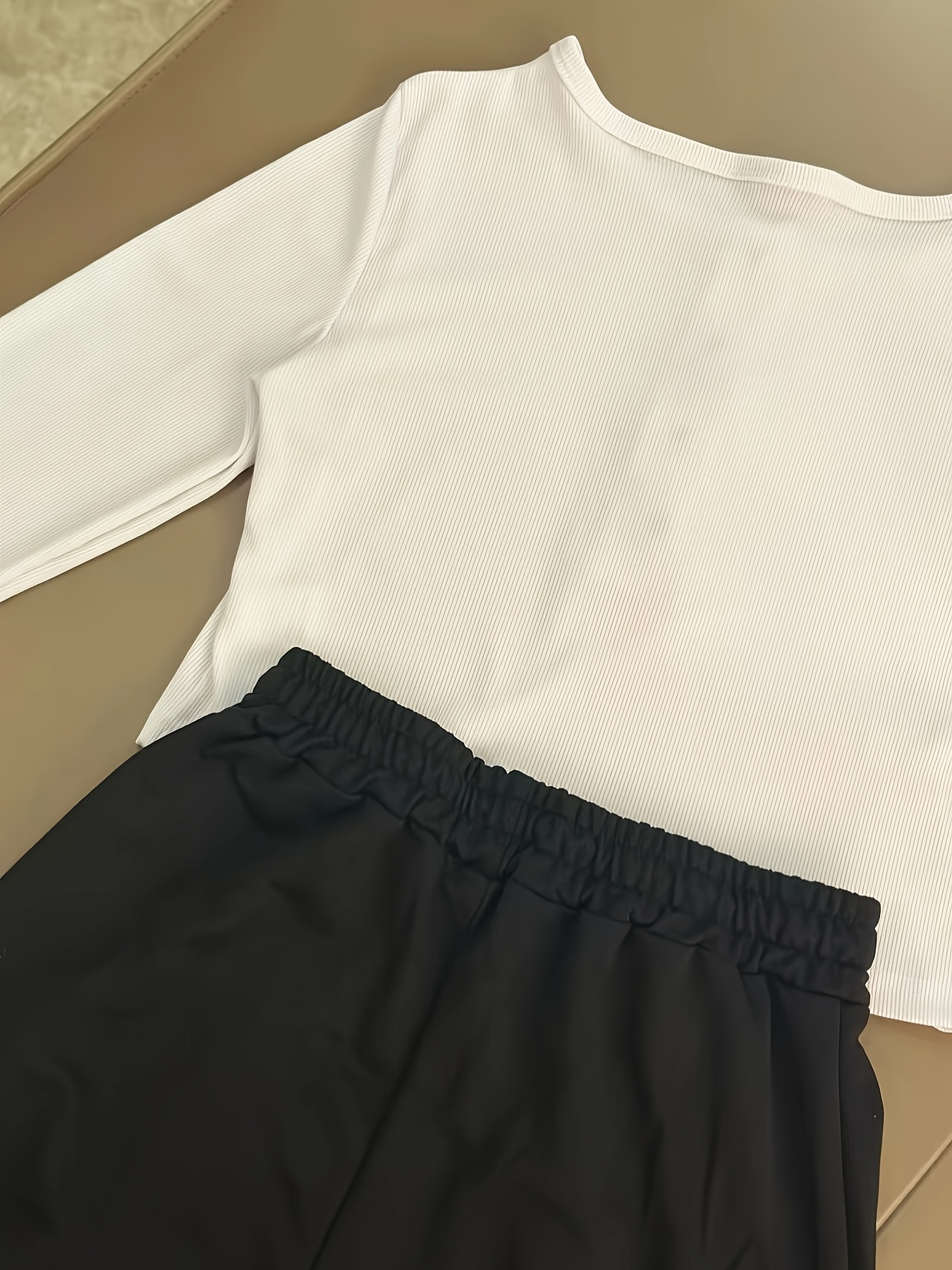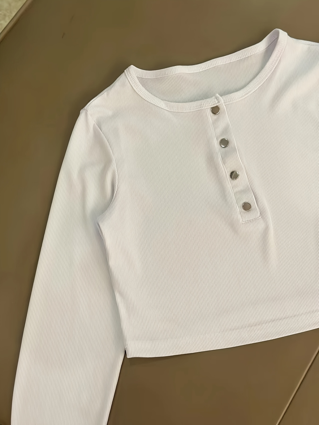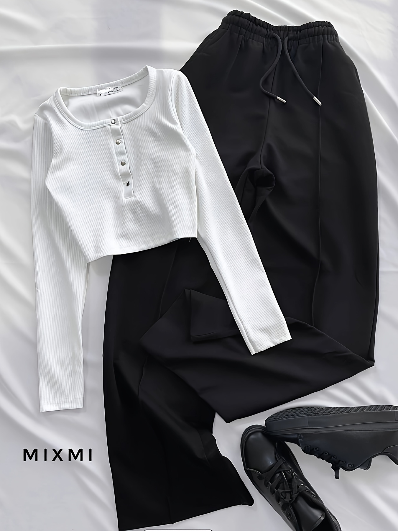 Casual Stretch Slim Fit Crew Neck Button Pullover T-Shirt + Elastic Waist Wide Leg Pants Long Set