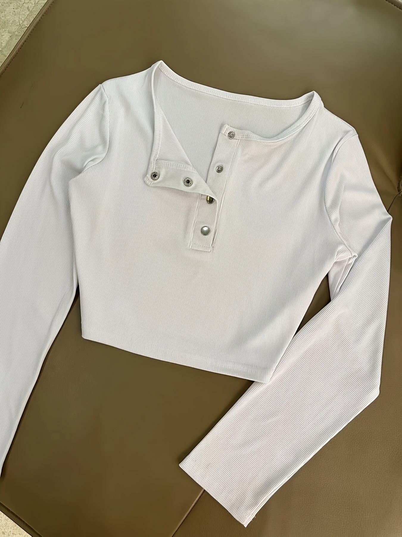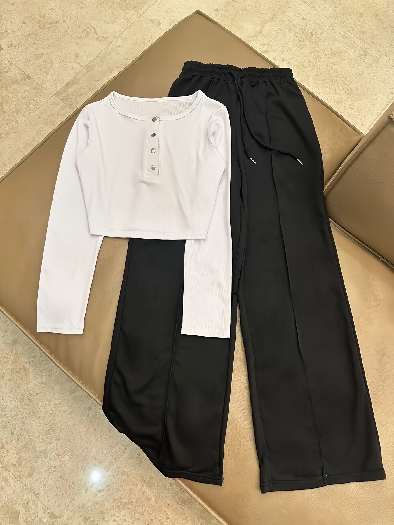 Casual Stretch Slim Fit Crew Neck Button Pullover T-Shirt + Elastic Waist Wide Leg Pants Long Set