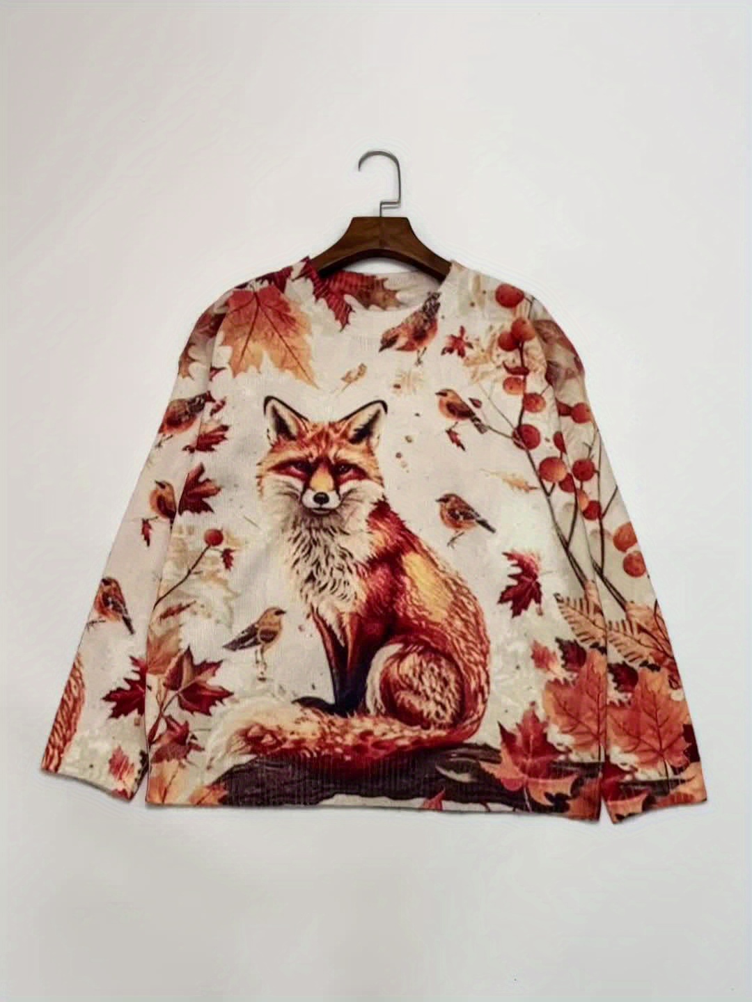 [Retro Fox Sweater] Retro 3D Fox & Birds Print Pullover Sweater | Long Sleeve Round Neck Loose Fit with Autumn Leaves Design, All-Season Casual Chic Top