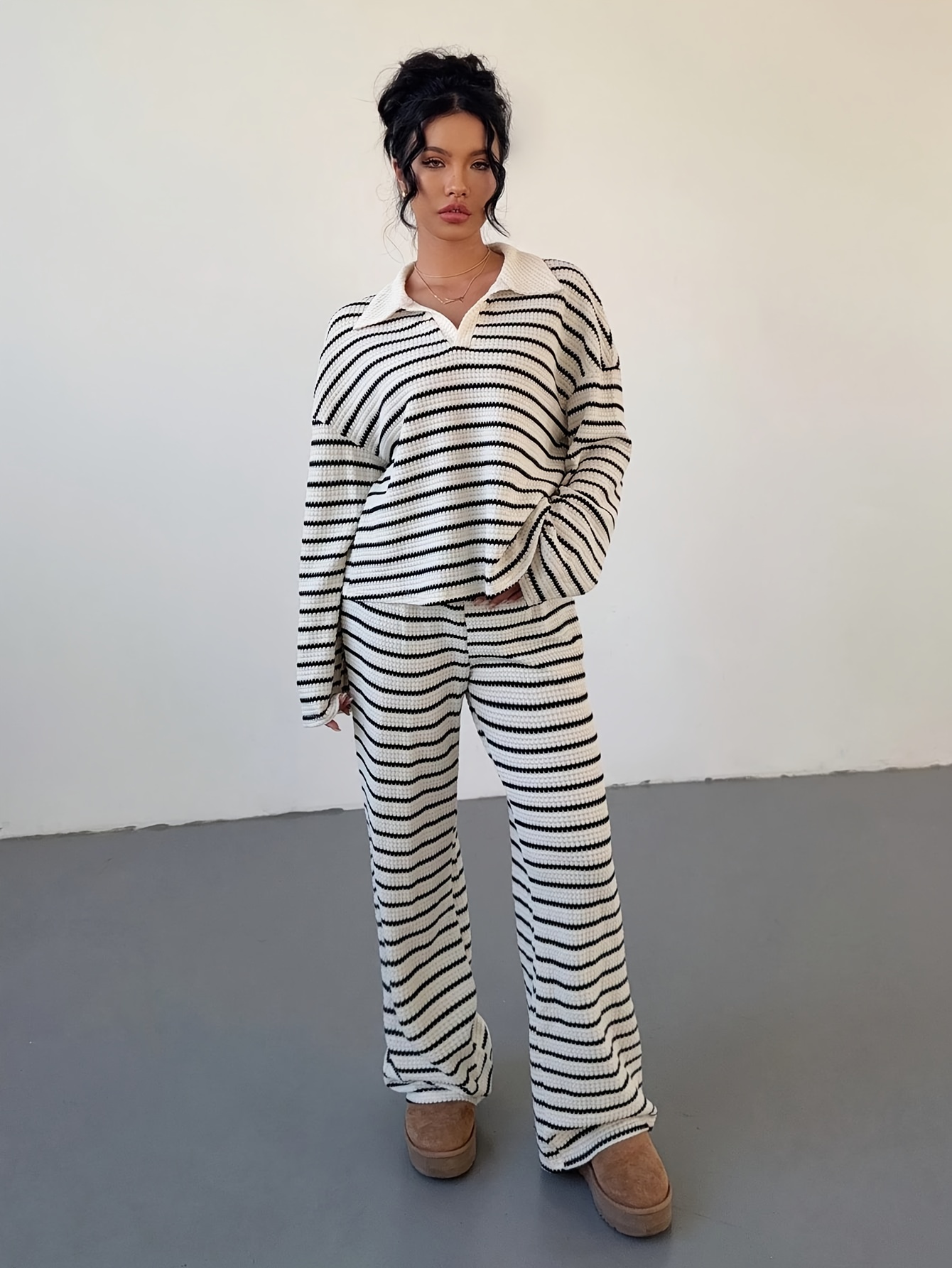 Women'S Spring/Autumn Two-Piece Set, Loose V-Neck and Drop Shoulder Long Sleeve T-Shirt with Elastic Striped Pants, Winter Pullover Outfit, Autumn and Winter Two-Piece Set