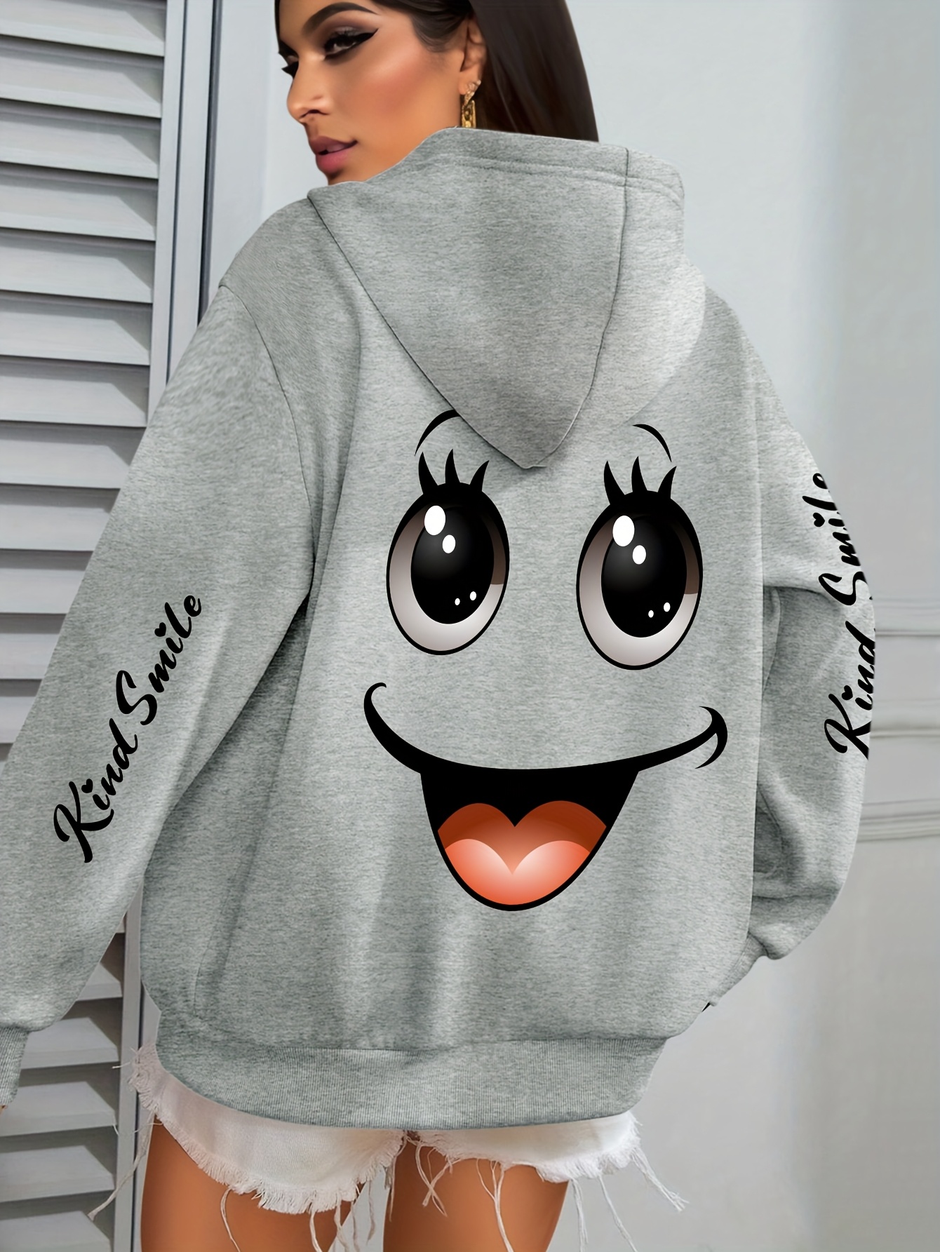 Plus Size smiling face Print Hoodie, Casual Fashion Sweatshirt, Hooded Pocket Drawstring Sweatshirt for Fall & Winter, Women's Clothing
