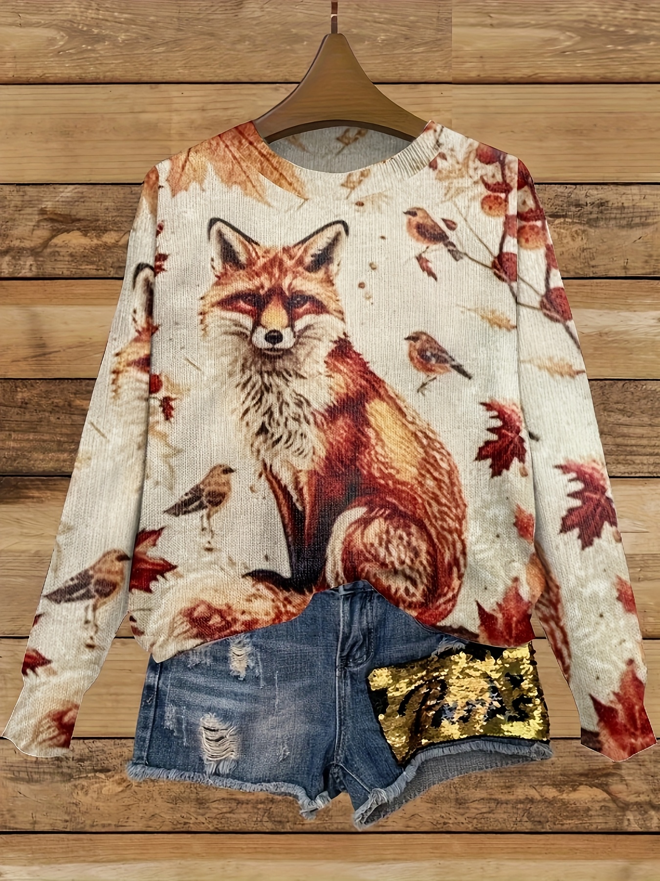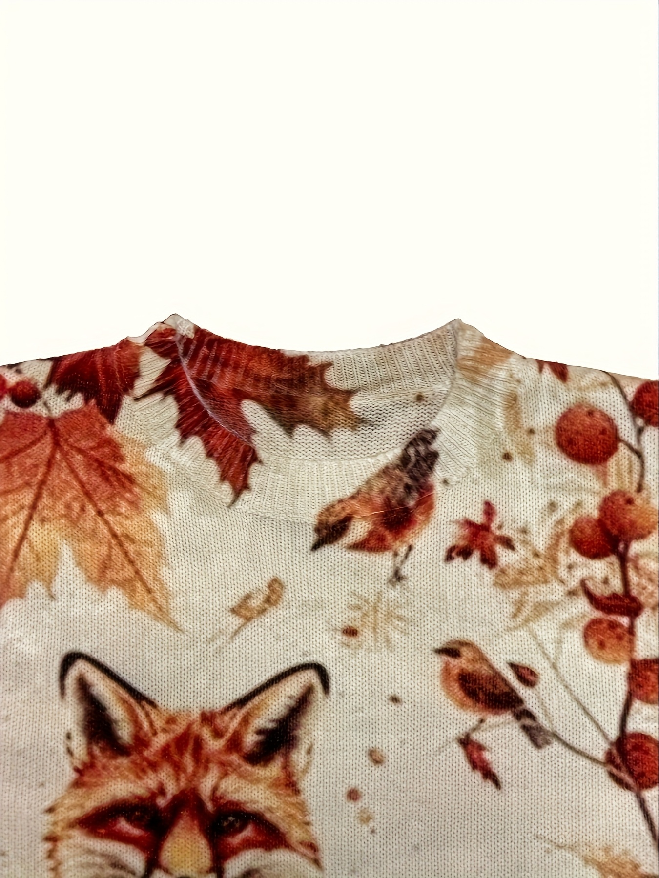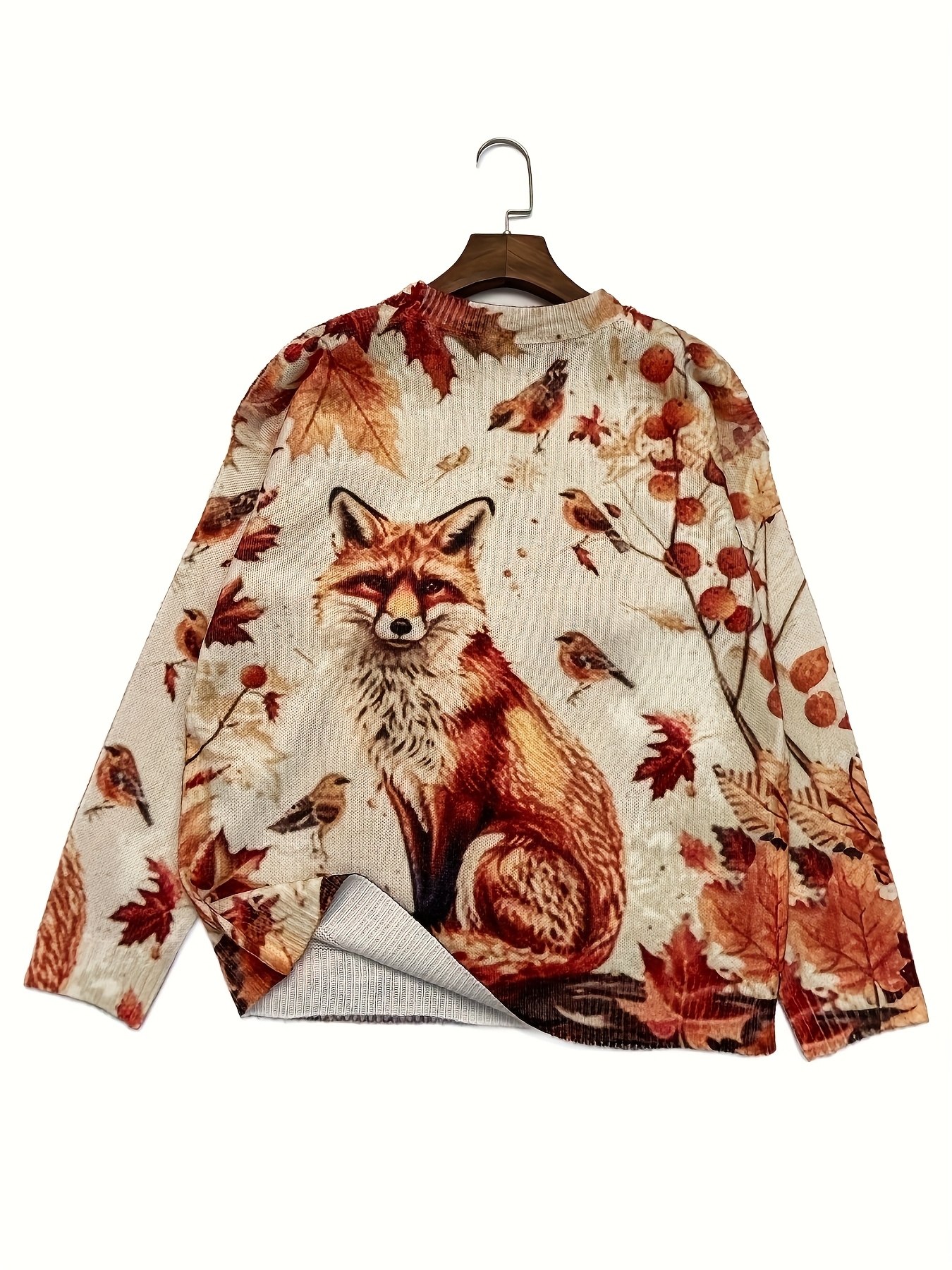 [Retro Fox Sweater] Retro 3D Fox & Birds Print Pullover Sweater | Long Sleeve Round Neck Loose Fit with Autumn Leaves Design, All-Season Casual Chic Top