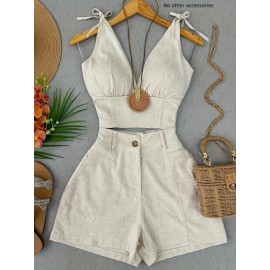 [Vintage Corset Top Set] Vintage Style Women's Elegant Sleeveless Corset Top & High-Waisted Shorts Set - Solid Color, Button Detail, Regular Fit, Spring/Summer Collection